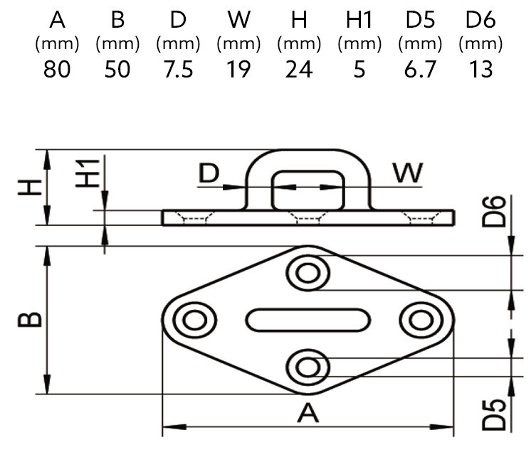Pontet en inox sur platine losange de 80x50mm. Idéal pour créer un point d'accroche ou de fixation sur une façade ou un mur.